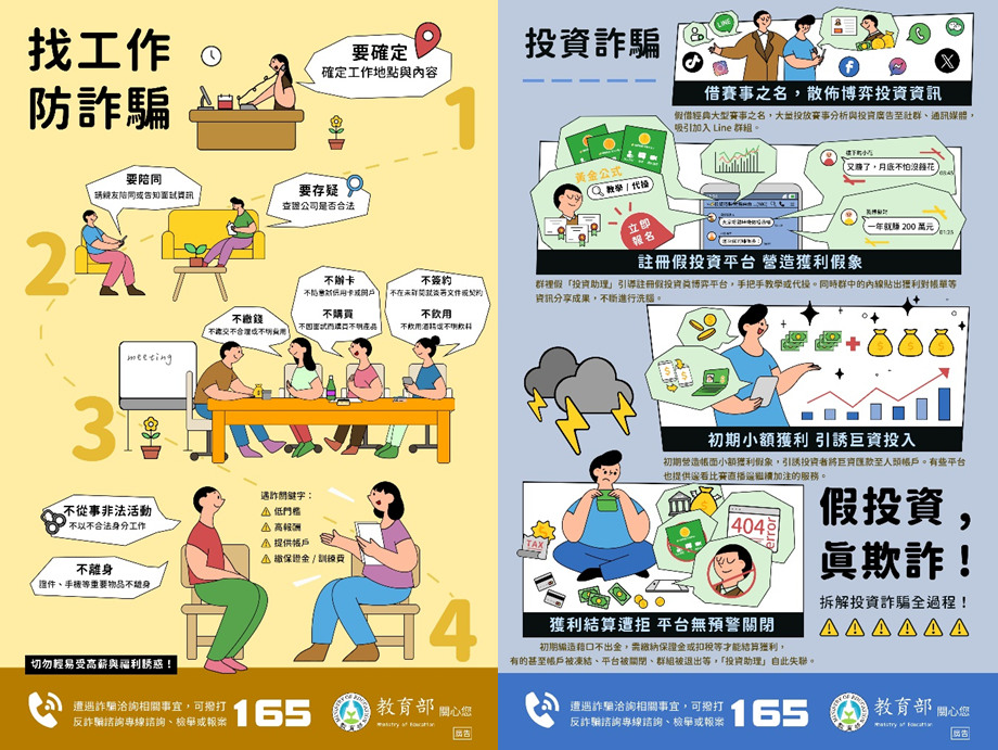 • 依據內政部警政署統計,當今最常發生的詐騙態樣為假投資詐騙,請學生謹記「防詐騙三不三要」原則: